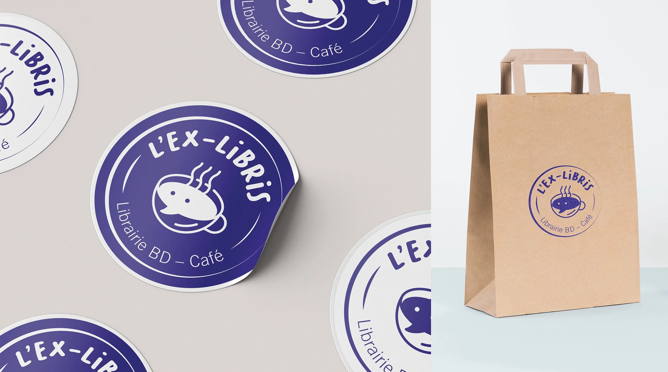 Une nouvelle librairie BD et café en ville, avec un nom qui inspire tout de suite. Ce tampon qui marque l’appartenance de l’ouvrage est mon point de départ créatif. Plusieurs pistes ont ensuite été imaginées, que ce soit en typographie ou bien en style d’illustration et c’est finalement la piste «personnage» qui représente au mieux cet endroit où il fait bon plonger dans tout un tas d’univers dessinés.